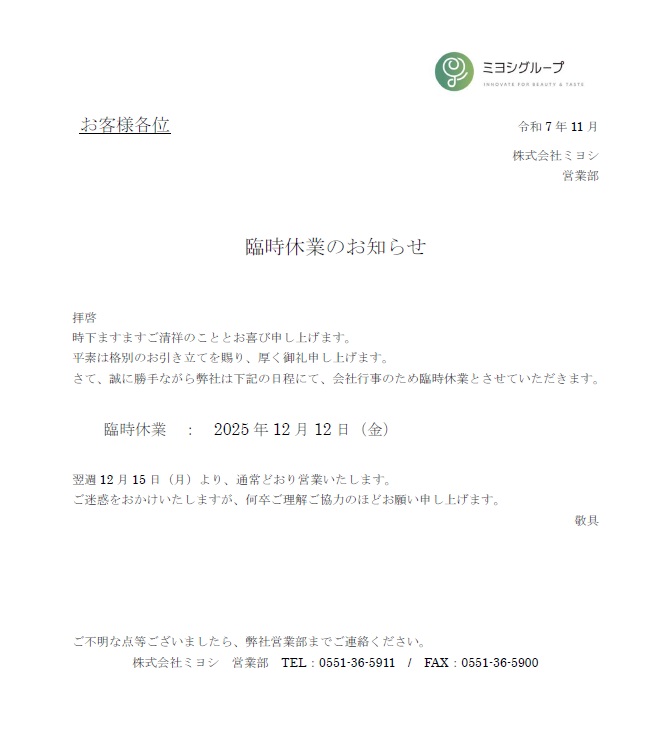 臨時休業のお知らせ 拝啓 時下ますますご清祥のこととお喜び申し上げます。 平素は格別のお引き立てを賜り、厚く御礼申し上げます。 さて、誠に勝手ながら弊社は下記の日程にて、会社行事のため臨時休業とさせていただきます。 臨時休業 : 2025年12月12日(金) 翌週12月15日(月)より、通常どおり営業いたします。 ご迷惑をおかけいたしますが、何卒ご理解ご協力のほどお願い申し上げます。